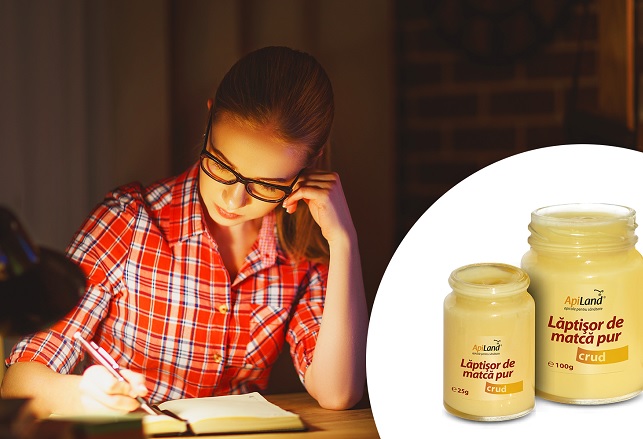 Specialiştii de la ApiLand consideră că alimentul cel mai indicat pentru a stimularea sistemului nervos şi pentru eliminarea stresului acumulat, este lăptişorul de matcă. Pe lângă aceste proprietăţi, lăptişorul de matcă contribuie la îmbunătăţirea memoriei, creşte capacitatea de concentrare şi asimulare a informaţiei şi elimină stările de somnolenţă, care pot apărea atunci când învăţăm asiduu.