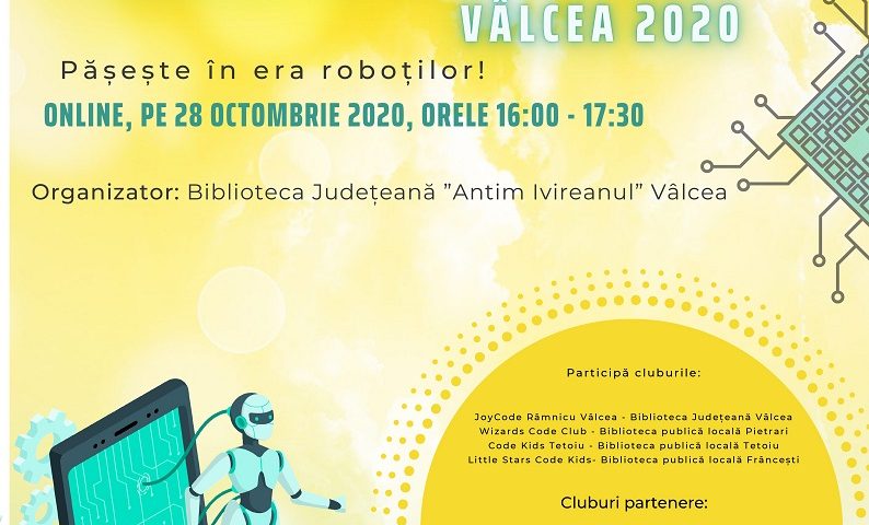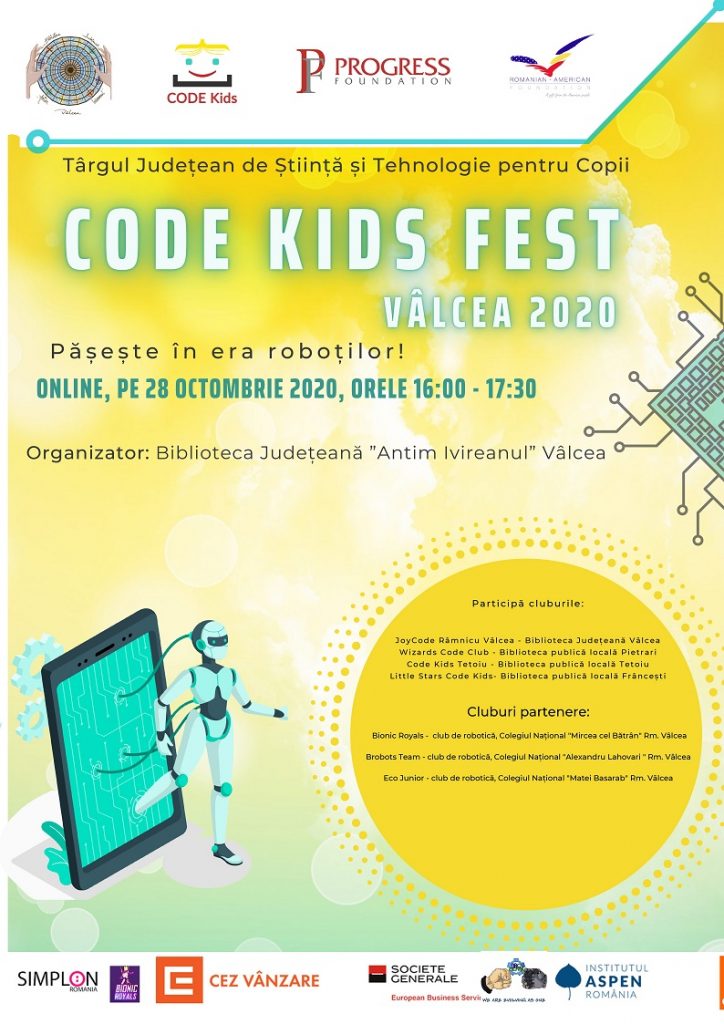 Biblioteca Județeană ”Antim Ivireanul” Vâlcea CODE Kids FEST 2020 – Târgul Județean de Știință și Tehnologie pentru copii, în data de 28 Octombrie 2020, orele 16:00-17:30, în format online.
