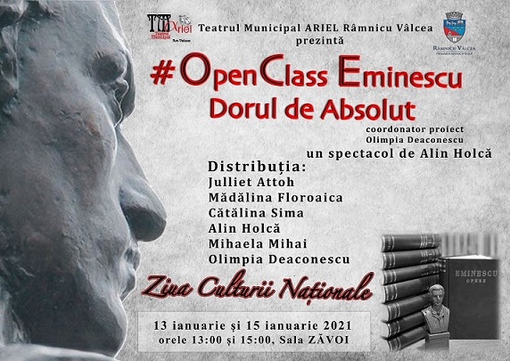 Teatrul Municipal ARIEL Râmnicu Vâlcea invită în sfârșit publicul în sala de spectacol, respectiv miercuri, 13 ianuarie 2021 și vineri, 15 ianuarie 2021, în ambele zile începând cu orele 13:00 și 15:00, în Sala Zăvoi, la spectacolul dedicat Zilei Culturii Naționale, intitulat „#OpenClass Eminescu – Dorul de Absolut”, coordonator proiect Olimpia Deaconescu, un spectacol de Alin Holcă.