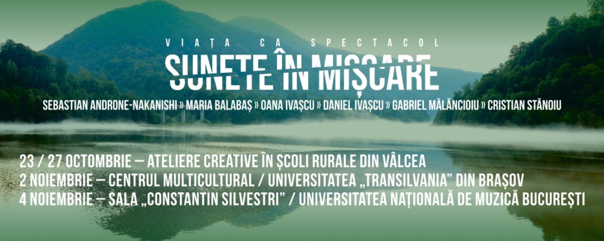 Proiectul „Sunete în mișcare” va continua și în săptămâna următoare, prin două evenimente dedicate publicului – cu focus special pentru studenții facultăților de arte vizuale și performative (muzică, teatru, dans). Astfel, etapele de cercetare și creație artistică – parcurse în vara aceasta de muzicienii Sebastian Androne Nakanishi, Gabriel Mălăncioiu, Maria Balabaș, Oana Ivașcu, Daniel Ivașcu și artistul video Cristian Stănoiu – sunt finalizate prin evenimente performative, cu muzică și proiecții video mixate în timp real. Evenimentele vor avea loc joi, 2 noiembrie la Centrul Multicultural al Universității „Transilvania” din Brașov, și sâmbătă, 4 noiembrie în Sala „Constantin Silvestri” a Universității Naționale de Muzică București, participarea fiind liberă și deschisă pentru toate vârstele. Cei șase artiști vor intra apoi în dialog cu publicul, pornind de la tema principală a proiectului („viața ca un spectacol”) sau teme specifice (despre utilizarea artelor sonore în explorarea dimensiunilor sociale ale schimbărilor climatice, practici inovatoare în activități și producții artistice conștiente de mediu).