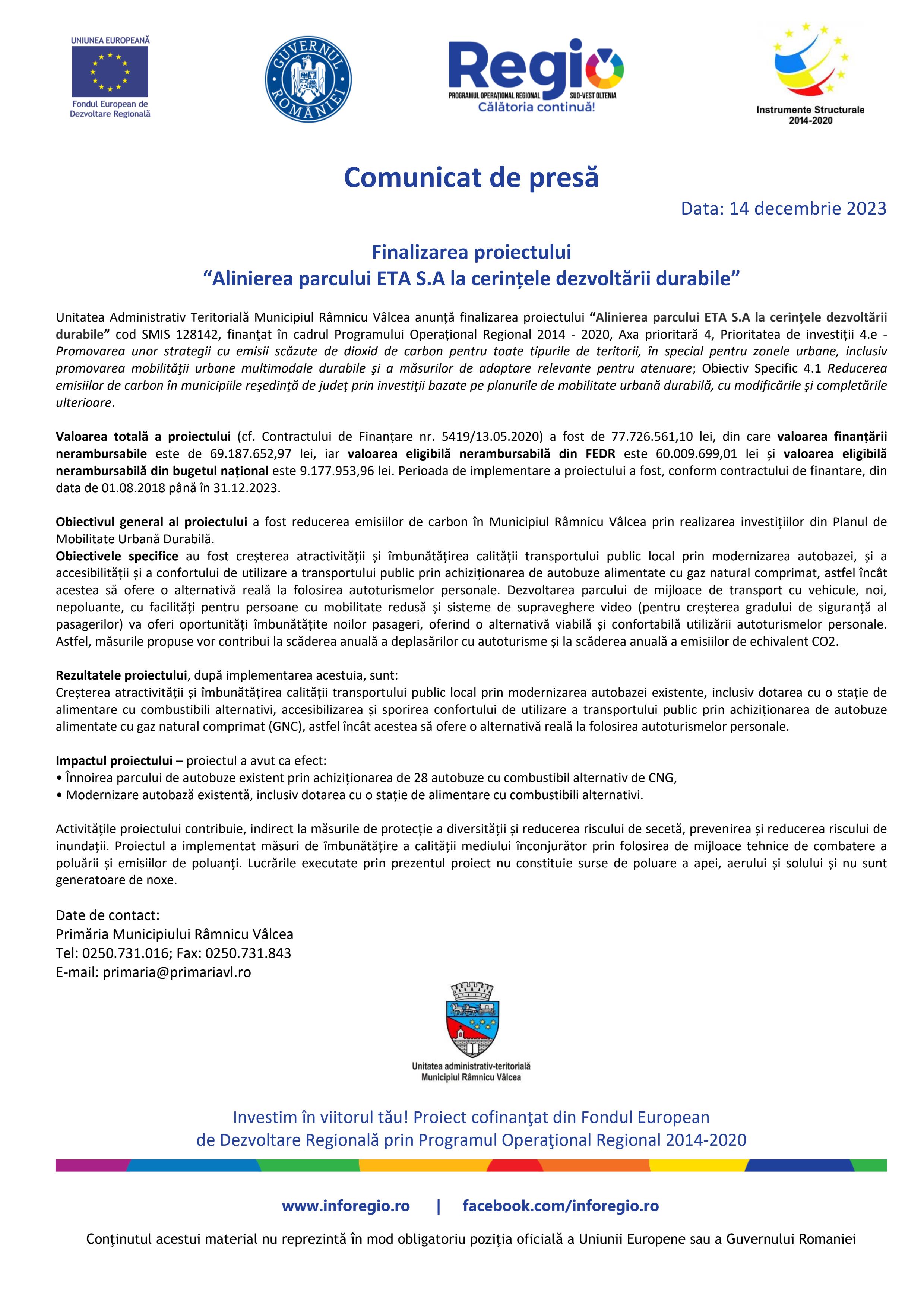 Finalizarea proiectului “Alinierea parcului ETA S.A la cerințele dezvoltării durabile”