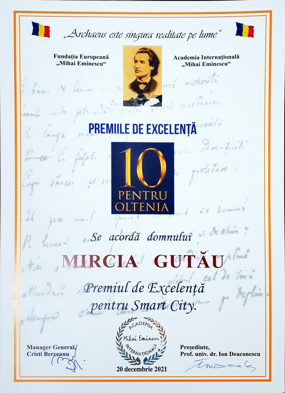 Prezent la Gala ”10 pentru Oltenia”, eveniment organizat în Craiova, luni, 20 decembrie 2021, primarul Mircia Gutău a primit Premiul de Excelenţă pentru Smart City pentru progresele realizate în acest sector la Râmnicu Vâlcea.