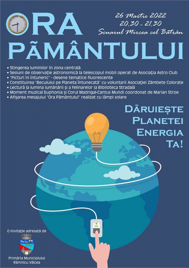 Consecventă angajamentului de a susţine şi promova toate măsurile îndreptate împotriva poluării şi schimbărilor climatice, Primăria Municipiului Râmnicu Vâlcea marchează încă o ediţie a celui mai amplu eveniment internaţional de mediu – ”Ora Pământului”. Sâmbătă, 26 martie 2022, între orele 20.30 – 21.30, în Scuarul Mircea cel Bătrân – care, pe parcursul acestei ore, va fi scufundat în întuneric – vor avea loc mai multe manifestări dedicate conştientizării modului în care fiecare dintre noi poate acţiona pentru salvarea Pământului: