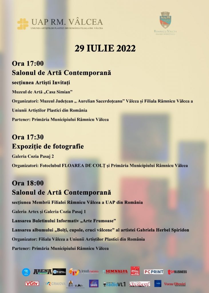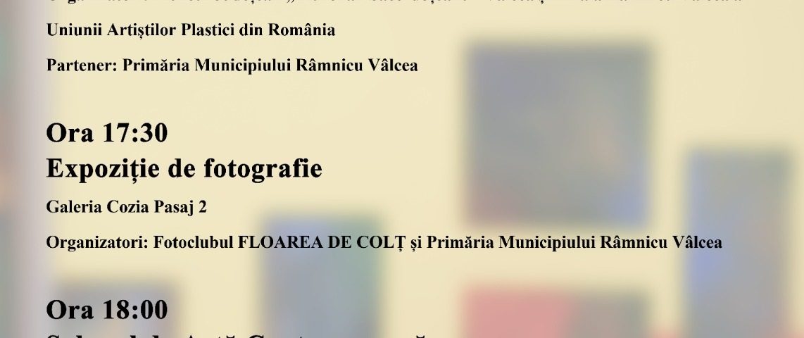 La ora 18ꓽ00, în Galeria Artex și în Galeria Cozia Pasaj 1 va avea loc vernisajul secțiunii dedicate membrilor Filialei Râmnicu Vâlcea a UAP din România a Salonului de Artă Contemporană, urmat de două lansăriꓽ cea a Buletinului Informativ „Arte Frumoase” și cea a a albumului „Bolți, cupole, cruci vâlcene” al Gabrielei Herbel Spiridon.