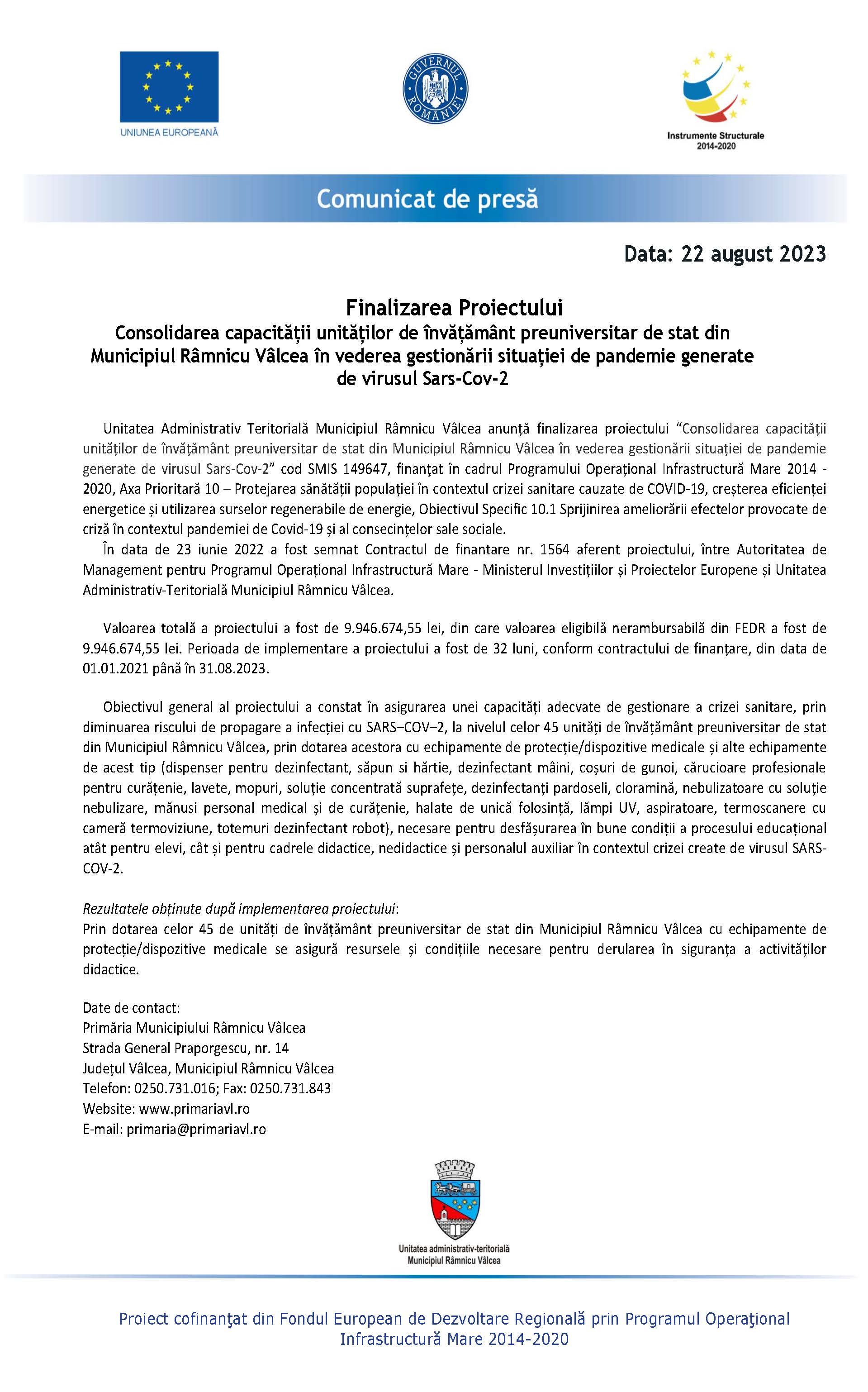 Finalizarea Proiectului Consolidarea capacității unităților de învățământ preuniversitar de stat din Municipiul Râmnicu Vâlcea în vederea gestionării situației de pandemie generate de virusul Sars-Cov-2